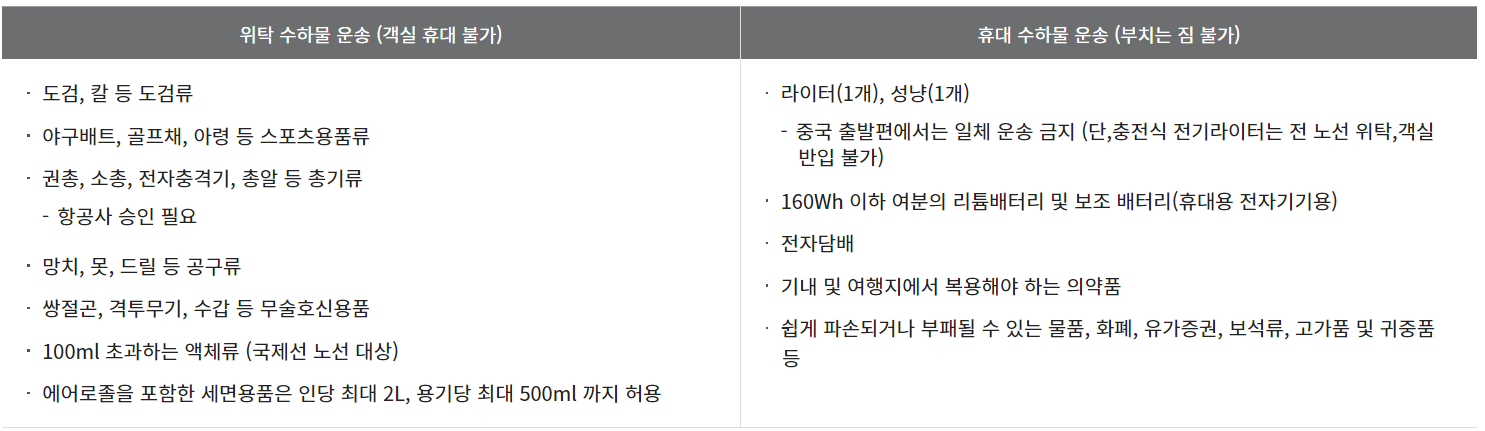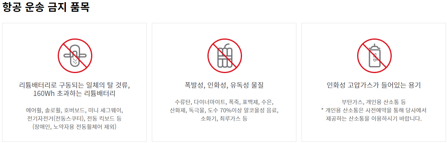 여분의 리튬배터리(보조배터리), 전자담배, 라이터는 부치는 짐으로 운송 불가하며 휴대하여 객실 반입만 허용합니다. 단,충전식 전기라이터는 전 노선 위탁,객실 반입 불가합니다. 그리고 1인당 2.5kg 이내의 드라이아이스 용기당(미국행) 또는 인당(호주발) 350ml 미만의 분말류(파우더류) 물품은 미국행 or 호주발 국제선 항공편에 한합니다.