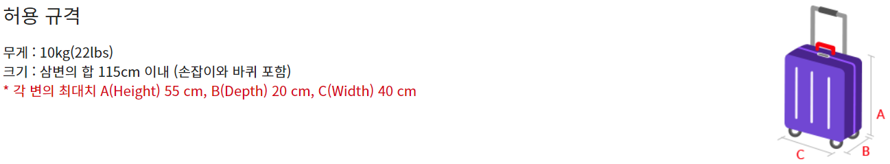 출처 : 아시아나항공 허용 규격의 무게는 10kg(22lbs), 크기는 손잡이와 바퀴 포함하여 삼변의 합 115cm 이내입니다. 각 변의 최대치 A(Height) 55cm, B(Depth) 20cm, C(Width) 40cm. 수하물은 머리 위 선반 또는 앞 좌석 밑에 안전하게 수납할 수 있어야 하며, 비즈니스 스위트 탑승 시 비즈니스 클래스 규정 적용합니다.