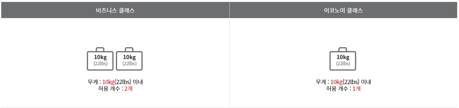 비즈니스와 이코노미 클래스에 따라 30kg(66lbs), 20kg(44lbs) 이내로 가능합니다.