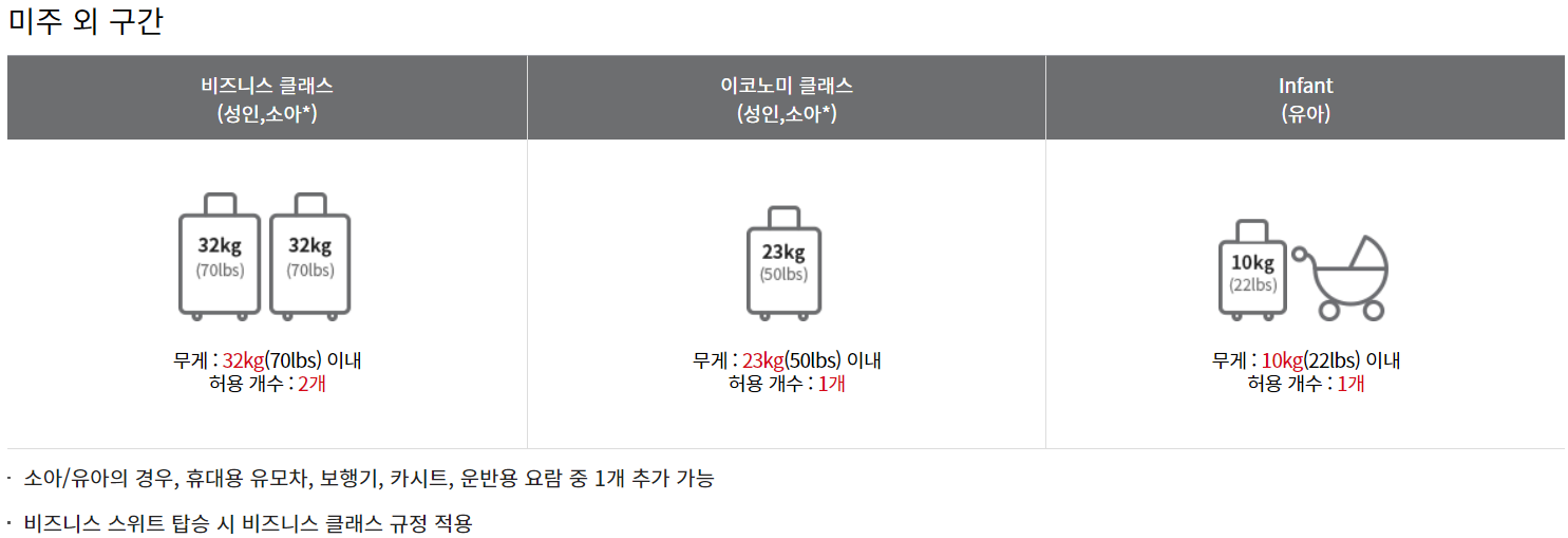 비즈니스&이코노미 클래스별 무료 위탁 수하물 허용량
