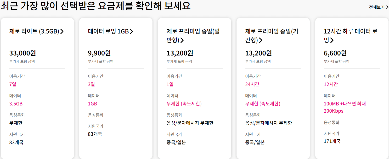 제로 라이트(3.5GB), 데이터 로밍 1GB, 제로 프리미엄 중일(일반형), 제로 프리미엄 중일(기간형), 12시간 하루 데이터 로밍