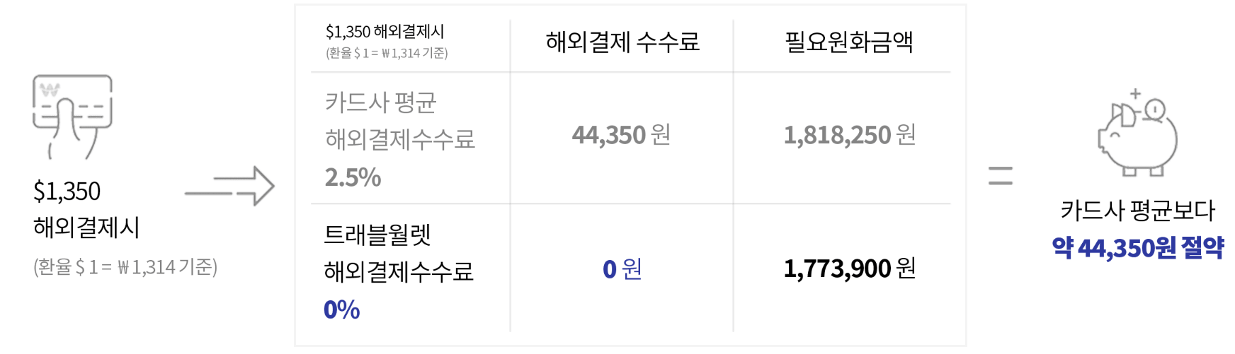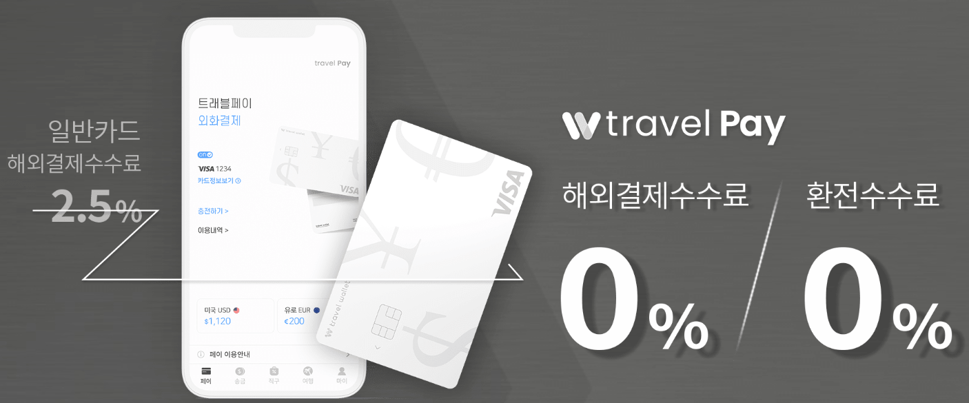 트래블월렛 앱을 이용하여 '트래블페이'라는 충전 시스템을 이용하여, 외화로 충전 후 수수료 없이 해외 결제하는 시스템으로 구성되어 있습니다.